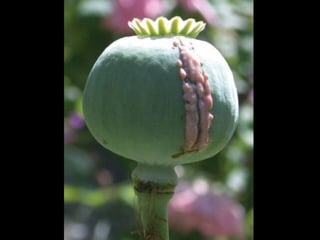 The document discusses opioids and their history. It describes how opium poppies contain morphine and other alkaloids. It discusses the development of the hypodermic syringe allowing injection of pure morphine in the 19th century. Morphinism became widespread after the US Civil War due to injured soldiers' opioid use. Morphine works by agonizing mu, delta, and kappa opioid receptors, preferring mu receptors. Side effects include respiratory depression, dependence, and addiction. Heroin is converted from morphine and crosses the blood-brain barrier faster, causing addiction. Codeine is converted to morphine in the liver and is used as a cough suppressant.
