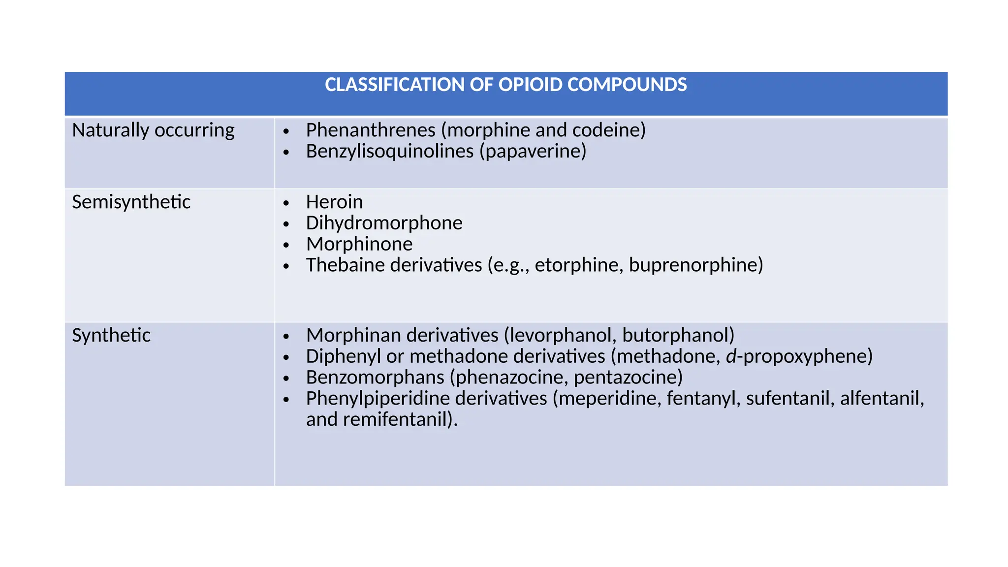 The document provides a comprehensive classification of opioid compounds, including naturally occurring, semisynthetic, and synthetic opioids, as well as their actions at opioid receptor subtypes (μ, δ, κ). It details the mechanisms of action of various opioid compounds, categorizing them as agonists, partial agonists, and antagonists along with their uses and side effects. Additionally, it highlights specific examples of opioids within each category and the health implications associated with their use.