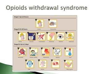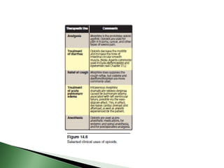 This document discusses pain and its treatment with opioids. It defines pain and describes how opioids work in the body by binding to opioid receptors to reduce pain sensation. Several opioid medications are discussed, including morphine, fentanyl, oxycodone, and others. The document outlines their mechanisms of action, therapeutic uses, and potential adverse effects like respiratory depression. It also covers opioid antagonists like naloxone that are used to reverse opioid overdoses.