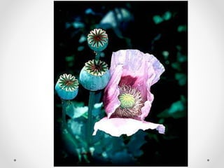 This document discusses opioids, which are drugs that bind to opioid receptors in the central nervous system to produce analgesic, calming, sedative, and euphoric effects. It describes endogenous opioids like endorphins and exogenous opioids extracted from opium or produced synthetically. The three main types of opioid receptors are mu, kappa, and delta. Representative opioid drugs are discussed, including morphine, heroin, methadone, fentanyl, buprenorphine, and antagonists like naloxone. The pharmacological effects, indications, and side effects of various opioids are outlined.