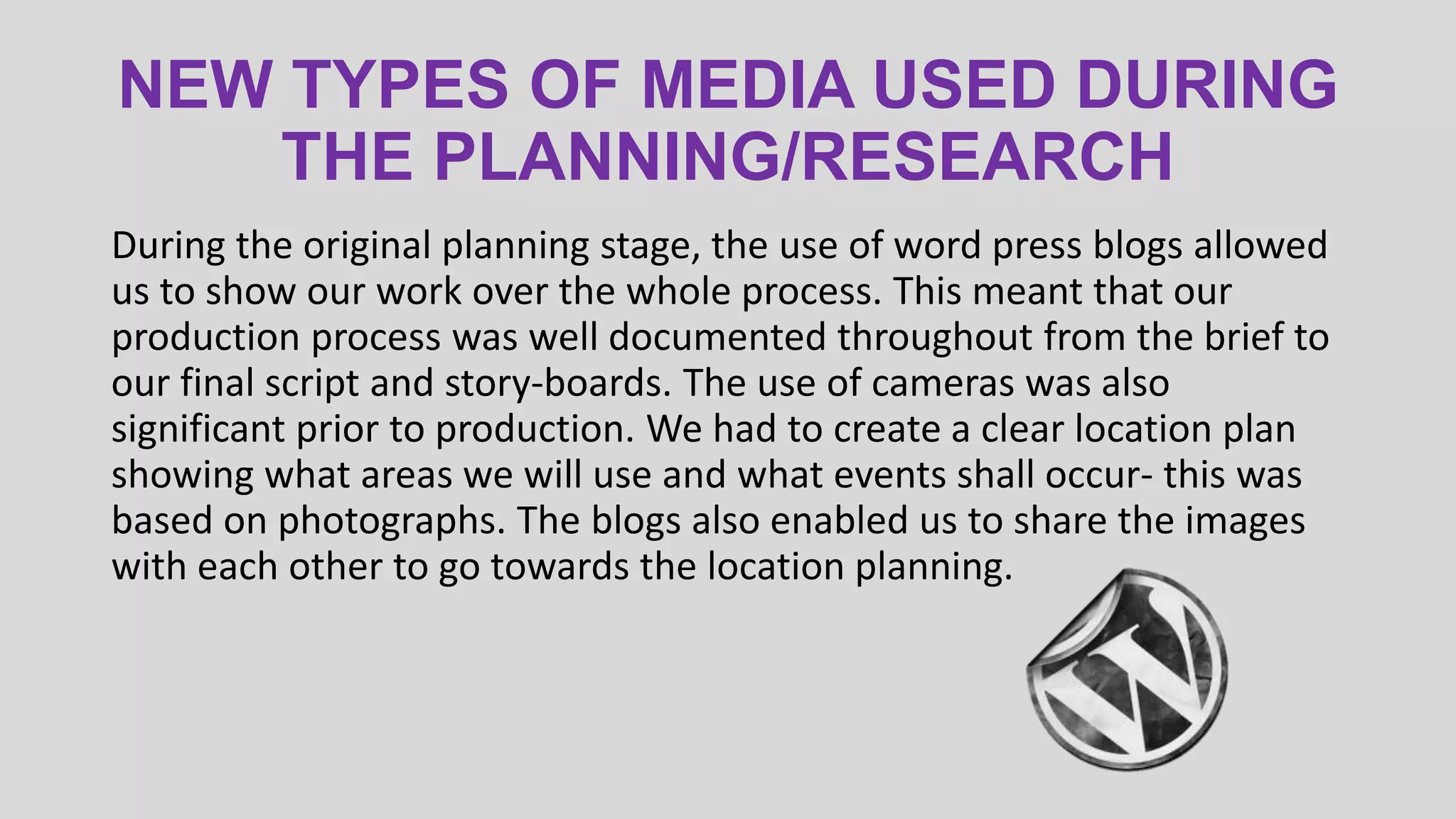 During the planning and production of a project, new media technologies were used at various stages. Wordpress blogs and cameras were used in the planning stage to document the process and aid in location planning. Adobe InDesign and Photoshop were used to design a magazine review and film poster during production, with Photoshop being an updated version. Social media like Twitter, Facebook, and YouTube helped distribute the video to a wide audience. Survey Monkey was used to collect audience feedback through an online survey linked to the social media posts.