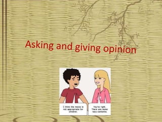 The document discusses asking for and giving opinions. It provides examples of expressions that can be used to ask for opinions such as "What do you think?" and "How do you feel about...". Expressions for giving opinions are also listed, like "In my opinion..." and "I think...". Sample dialogues demonstrate asking for and stating opinions on topics like jobs and places. Multiple choice questions with answer keys are included to assess understanding of opinion expressions.