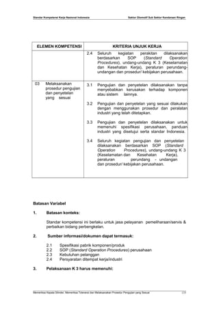 Dokumen ini menguraikan standar kompetensi kerja nasional untuk sektor otomotif, khususnya dalam merakit dan memeriksa kepala silinder kendaraan ringan serta melaksanakan prosedur pengujian. Elemen kompetensi mencakup pemeriksaan toleransi, perakitan, dan pengujian sesuai dengan standar industri dan SOP yang ditetapkan. Keselamatan dan kesehatan kerja (K3) juga menjadi fokus utama dalam setiap kegiatan yang dilaksanakan.
