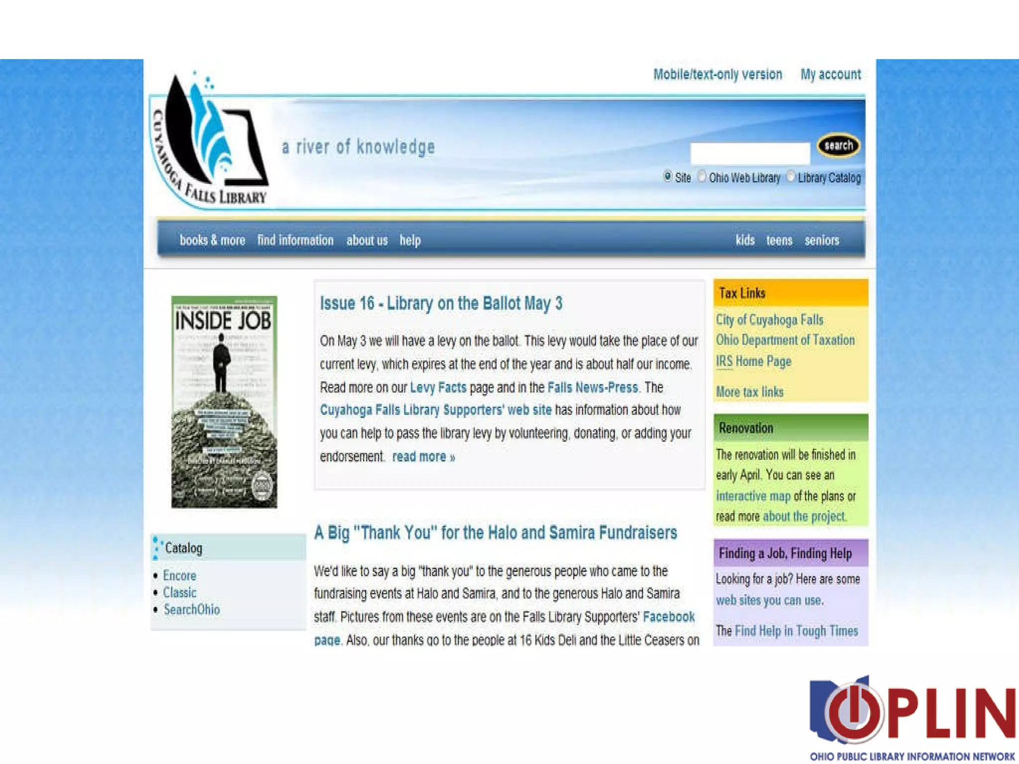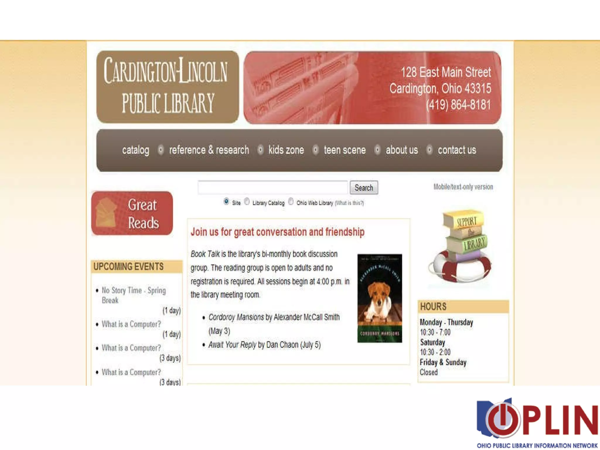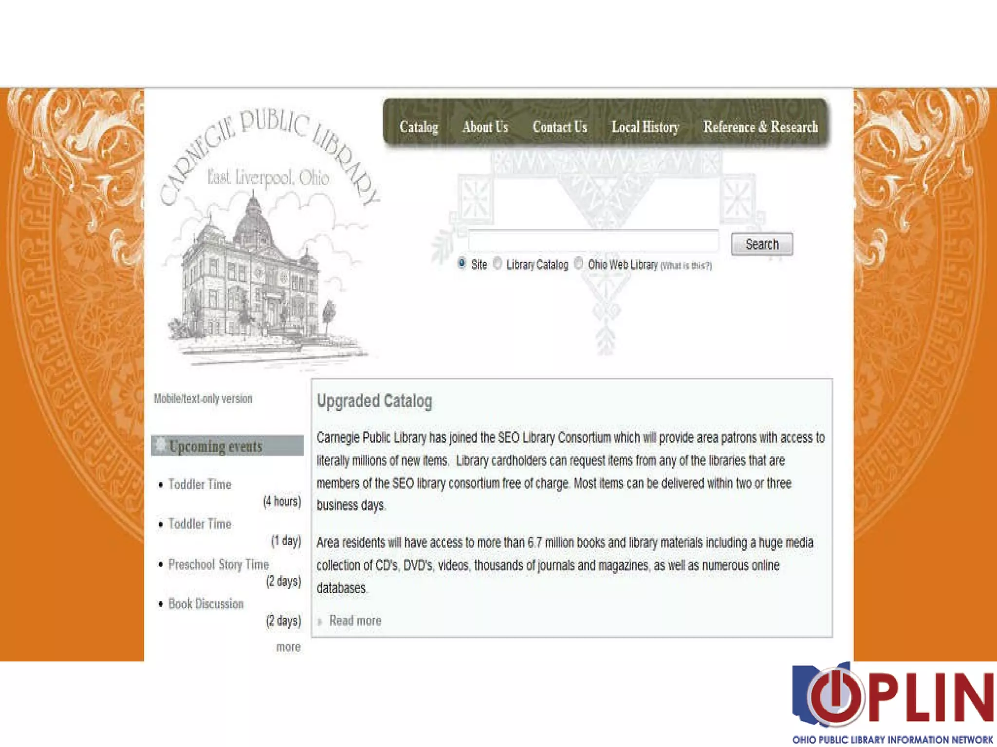 The document discusses features and the process for setting up a new content management system (CMS) website for a library. It mentions the included features in the CMS kit like standards compliance, mobile friendliness, interactive elements, and security features. It also provides tips for customizing the site with themes, integrating other systems, and cleaning up the existing website content before transitioning to the new CMS.