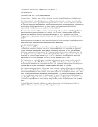This document provides an overview and reference information for Oracle Process Manufacturing APIs. It describes: