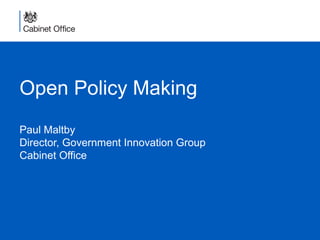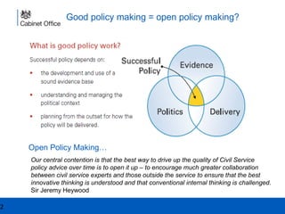 Open policy making involves greater collaboration between civil servants and outside experts to improve policy quality. It requires an open mindset and tools to gather diverse viewpoints and evidence to develop innovative, tested solutions. While open approaches like crowdsourcing and co-production allow more ambition, policies still must fit an organization's constraints. The goal is to apply an open mindset and test opportunities to involve the public more in evidence gathering and policy development.
