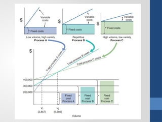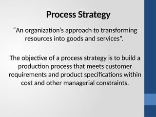 Chapter 7 discusses process strategy, which is an organization's method for transforming resources into goods and services to meet customer and product specifications while managing costs. It outlines four main process strategies: process focus for low-volume, high-variety production; repetitive focus for assembling products in modules; product focus for high-volume, low-variety production; and mass customization to meet unique customer demands. Additionally, the chapter highlights the importance of process analysis and design, production technology advances, and the need for process redesign to adapt to changing market conditions.