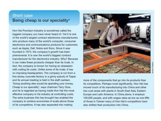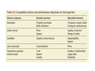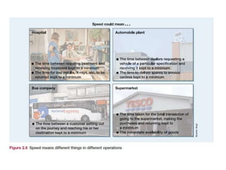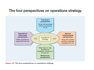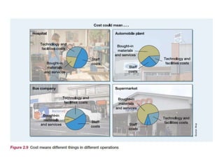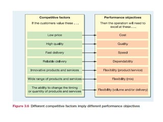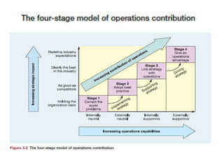 The document discusses operations management, focusing on its contributions to business performance through various objectives such as quality, speed, dependability, flexibility, and cost. It emphasizes how effective operations management can significantly impact financial performance and provide competitive advantages. Additionally, it explores different perspectives on formulating operations strategy and improving productivity, while illustrating these concepts with examples and detailed analyses.