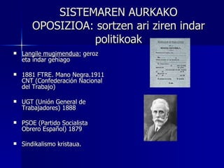 SISTEMAREN AURKAKO OPOSIZIOA:sortzen ari ziren indar politikoak Langile mugimendua: geroz eta indar gehiago 1881 FTRE. Mano Negra.1911 CNT (Confederación Nacional del Trabajo) UGT (Unión General de Trabajadores) 1888 PSOE (Partido Socialista Obrero Español) 1879 Sindikalismo kristaua.