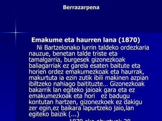 Berrazarpena Emakume etahaurren lana (1870) Ni Bartzelonako lurrin taldeko ordezkaria nauzue, benetan talde triste eta tamalgarria, burgesek gizonezkoak baliagarriak ez garela esaten baitute eta horien ordez emakumezkoak eta haurrak, makurtuta ia ezin zutik ibili makinen azpian ibiltzeko nahiago baitituzte… Gizonezkoak bakarrik lan egiteko jaioak gara eta ez emakumezkoak eta hori ez badugu kontutan hartzen, gizonezkoek ez dakigu zer egin,ez baikara lapurtzeko jaio,lan egiteko baizik (...) 1870.eko abuztuak 28 (Federación)