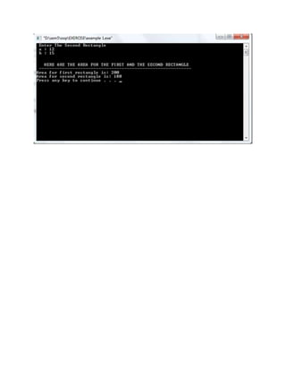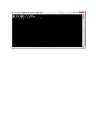 This document contains 9 exercises demonstrating object-oriented programming concepts in C++ like classes, methods, constructors, and destructors. The exercises create classes to represent geometric shapes, birds, boxes, and more. Methods are defined to set and get data, calculate areas, and display output. Constructors and destructors are used to initialize and cleanup object memory.