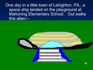 An alien named Mr. Oppa Lippus visits Mahoning Elementary School. He is 10 feet tall with 4 pairs of eyes, 3 noses, 3 mouths, 8 arms, and 2 pairs of legs. He lands his spaceship on the playground. The students are surprised but unafraid of him. He introduces himself and shares that on his planet, Barnick, there is only love and understanding. He stays at the school, hugging students with his 8 arms and answering their questions. The students want him to stay and be part of their school community.