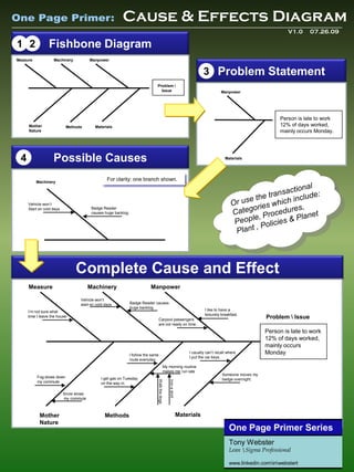 This document provides an overview of a cause and effects diagram, also known as a fishbone diagram, which is a visual tool used in problem solving. The fishbone diagram displays possible root causes of a problem categorized into branches. It is used in early problem solving stages to brainstorm potential causes. The document outlines the basic steps to construct a fishbone diagram, which involves drawing the backbone and branches, labeling the branches, listing the problem, and identifying factors within each branch that may be causing the problem. Completed diagrams can then be evaluated to eliminate irrelevant causes and focus on the most likely causes to address.