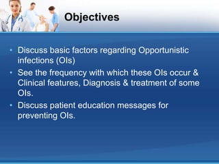 This document discusses opportunistic infections (OIs) that occur in patients with AIDS. It defines AIDS according to CDC and NACO criteria involving OIs or low CD4 counts. Common OIs seen in India are described such as tuberculosis, candidiasis, cryptosporidiosis, herpes zoster, toxoplasmosis, and Pneumocystis pneumonia. Symptoms, diagnosis, and treatment of these OIs are outlined. The role of patient education in prevention and treatment adherence is also discussed.