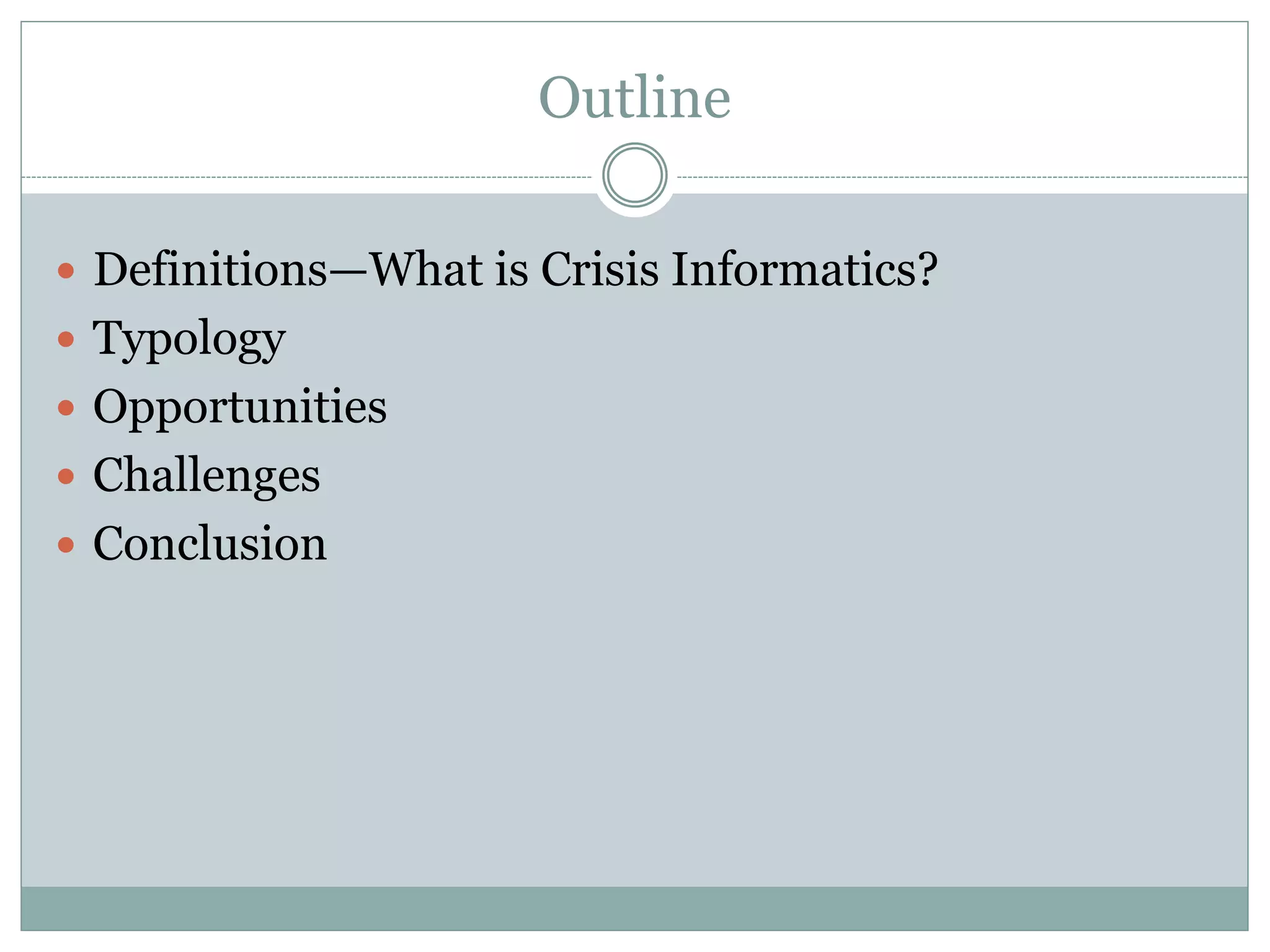 This document outlines opportunities and challenges in crisis informatics, which is an integrated approach to the technical, social, and informational aspects of crises. It begins with definitions of key terms like crisis informatics and crowdsourcing. It then discusses types of social media and ways crowdsourcing is used during crises. Opportunities of crisis informatics include citizen-based hazard science, situational awareness, and damage estimates. Challenges include ensuring data quality, integrating crowdsourced and authoritative data, and addressing legal/policy issues. The document concludes by identifying priority research challenges such as developing validation methods and best practices for data integration.