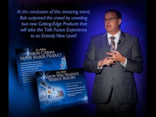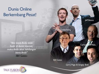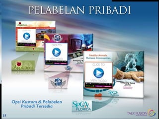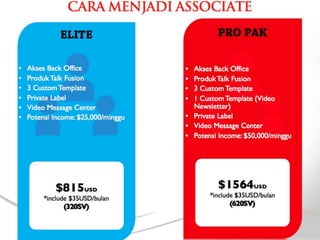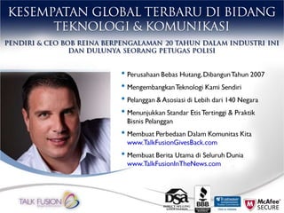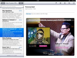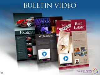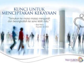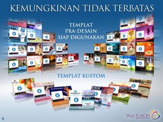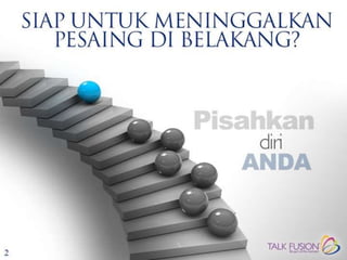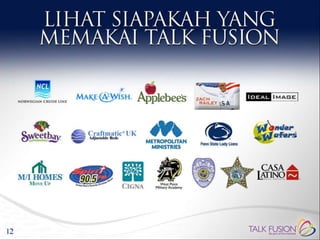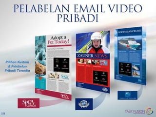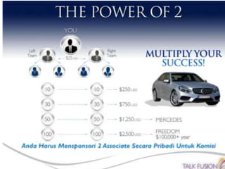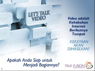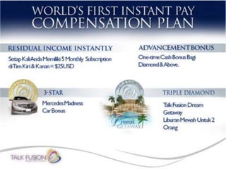 Dokumen ini menjelaskan berbagai fitur dan manfaat dari platform video email serta model bisnis Talk Fusion yang menawarkan komisi instan dan berbagai bonus bagi para penggunanya. Fitur-fitur mencakup video conferencing, personalisasi merek, dan optimasi SEO, mengedepankan kolaborasi global dan kemudahan dalam pemasaran. Talk Fusion juga diakui oleh beberapa pakar keuangan dan menawarkan peluang pendapatan residual dengan struktur bonus yang menarik.