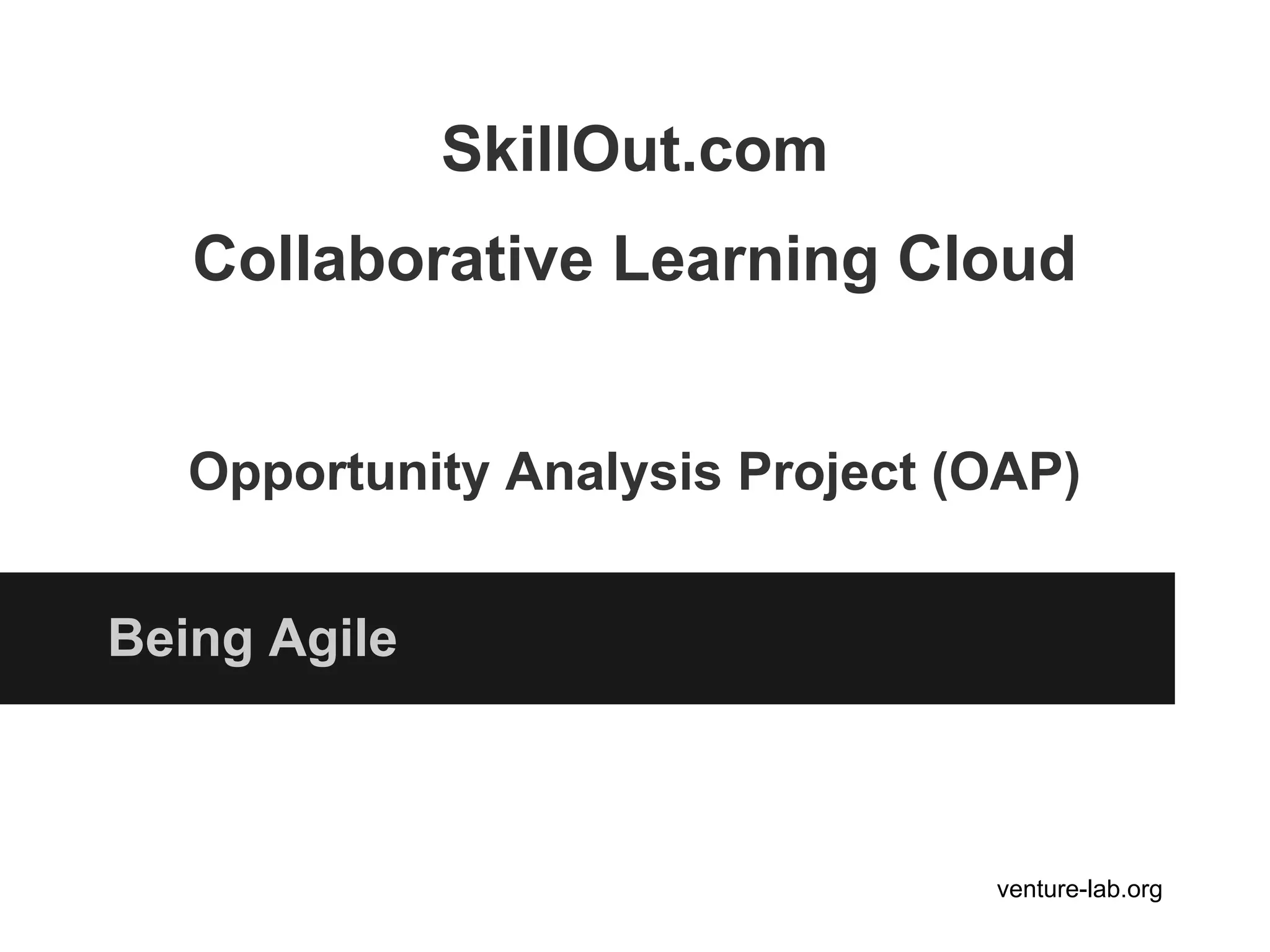 This document summarizes an opportunity analysis project for a collaborative learning cloud called SkillOut. It includes sections on the project overview, application mockups, market size estimation and assumptions, market potential, interviews and surveys conducted, lessons learned, and introductions of team members. The project aims to create a new innovative education system using today's technologies and learning about neuroscience to meet tomorrow's needs by tearing down walls of the current system. Market size estimates 500 universities with 4.5 million students subscribing and paying monthly and annual fees, with additional revenue from customization, hosting, and other knowledge providers. Surveys found students want better syllabi and reputable providers, while providers want increased motivation and easy to use platforms.