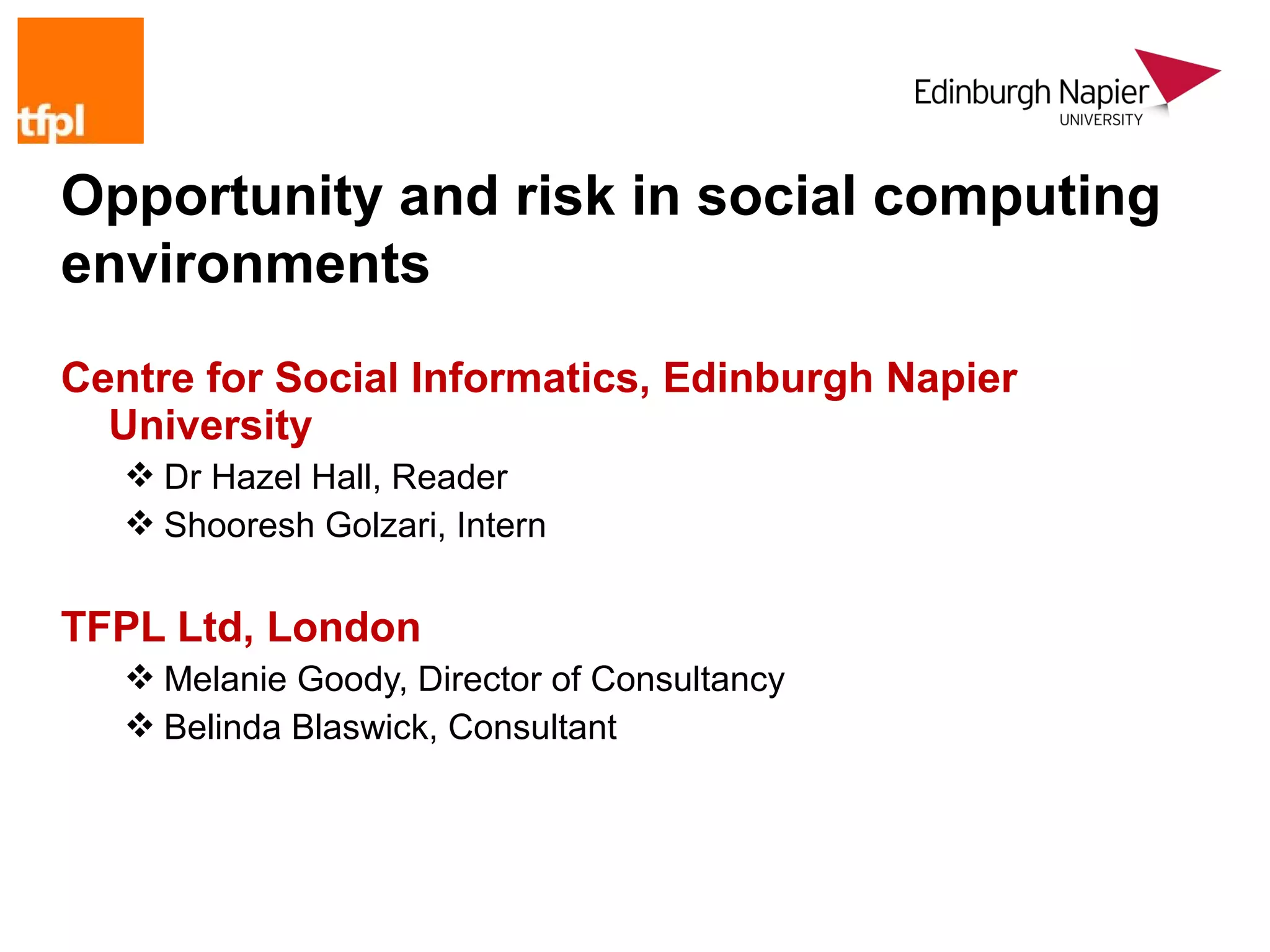 The document outlines research conducted by the Centre for Social Informatics at Edinburgh Napier University on the opportunities and risks of social computing tools in organizational collaborative work. It addresses the varying levels of adoption and perceived benefits and concerns about social computing within information and knowledge management professionals. The study emphasizes the importance of effective implementation and management of these tools to capitalize on their potential advantages while mitigating associated risks.