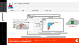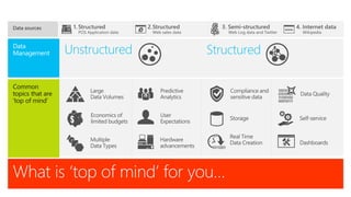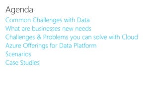 The document discusses the potential of leveraging data and analytics for businesses, highlighting a projected $1.6 trillion 'data dividend' available to companies that embrace innovative data practices. It outlines Microsoft's comprehensive end-to-end data platform and cloud services designed to facilitate real-time data analysis, empower employees, and enhance decision-making. Key trends such as the rise of IoT, diverse data types, and cloud computing are also emphasized, along with real-world examples of organizations benefiting from these technologies.