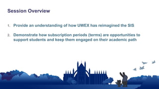 The document outlines the reimagined student engagement system at the University of Wisconsin-Extension, emphasizing subscription periods that support non-traditional learners through self-paced academic programs. It provides insights into degree completion and certificate offerings, the roles of academic success coaches, and the use of data for predicting student needs and outcomes. Overall, the focus is on enhancing the student experience and flexibility throughout their academic journey.