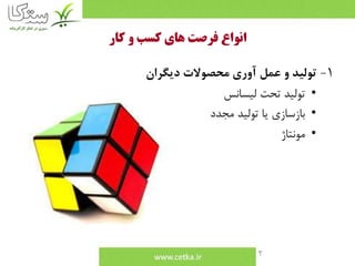 يتناول المستند استراتيجيات تطوير الأعمال وفرص السوق المختلفة، بدءًا من تحديد الفرص والتحليل، وصولاً إلى استراتيجيات الإنتاج والتوزيع. كما يتطرق إلى أهمية الابتكار وتلبية احتياجات السوق المتغيرة، بالإضافة إلى تقنيات تسويق جديدة وتجديد الأنشطة التجارية. يتضمن أيضًا معلومات حول أدوات الإدارة والتطوير لتحقيق النجاح في الأعمال.