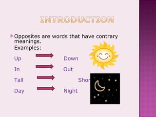 The document discusses opposites and provides examples of opposite words like up/down and in/out. It instructs students to make a list of opposite words in groups and share them with the class. The document also gives examples of using opposite words to describe people, things, and animals. It lists more opposite word pairs and describes some activities like a matching game and poster project where students can further explore opposites.