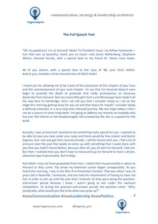 The document appears to be a transcript of Oprah Winfrey's 2013 commencement speech at Harvard University. In the speech, Oprah expresses her gratitude for receiving an honorary doctorate from Harvard. She shares her journey from rural Mississippi to becoming a successful television host and journalist. Oprah hopes her story can inspire others who have felt disadvantaged. The transcript includes several paragraphs from Oprah's full speech where she discusses developing her career in television unexpectedly after entering a beauty pageant as a teenager.