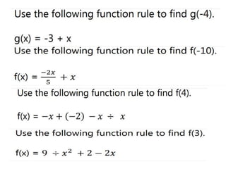 - Functions can be evaluated using algebraic expressions by substituting the expression for the variable