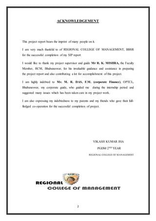 This document provides an overview of a project report on working capital management at Odisha Power Transmission Corporation Limited (OPTCL). It includes an acknowledgement section thanking those who assisted and guided the project. It also includes declarations certifying that the project was completed and meets requirements for a PGDM program. The project report contains 6 chapters which will analyze OPTCL's working capital ratios from 2009-2013, components of working capital, and make recommendations. Efficient working capital management is important for OPTCL to reduce costs and increase profits while maintaining operations and meeting obligations.