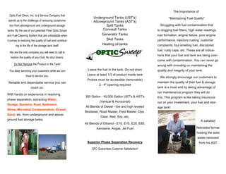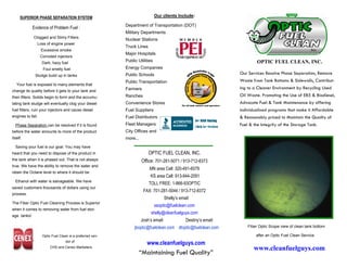 Optic Fuel Clean, Inc. provides fiber optic fuel cleaning services to a variety of clients including government agencies, utilities, transportation companies, hospitals, schools, and farms. They use a patented fiber optic scope and cleaning system to remove contaminants from underground and aboveground fuel storage tanks, restoring fuel quality without removing the product from the tank. Their goal is to save customers money by salvaging fuel that would otherwise be disposed of due to contamination.