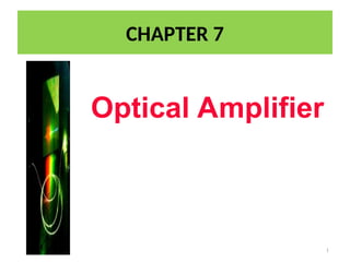 The document discusses optical amplifiers, emphasizing their need to overcome limitations of electronic amplification. It highlights types such as semiconductor laser amplifiers and erbium-doped fiber amplifiers, explaining their principles of operation, gain characteristics, and noise performance. Applications include in-line amplification for long-distance transmission and booster amplifiers for improved receiver sensitivity.