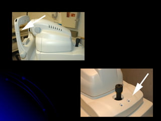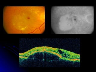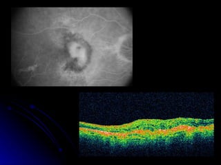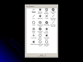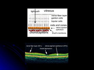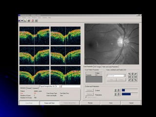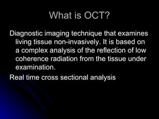 Optical Coherence Tomography (OCT) is a non-invasive imaging technique that examines living tissue using low coherence radiation. It provides high resolution cross-sectional images of the retina in real time. OCT allows for both qualitative and quantitative analysis of retinal thickness, volume, and nerve fiber layer thickness. Scans can be customized using different protocols like line, circle, or radial line scans to examine specific areas of interest like the macula or optic nerve.