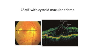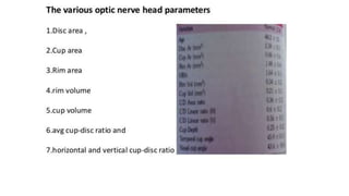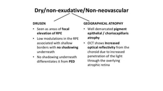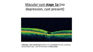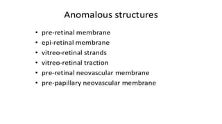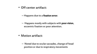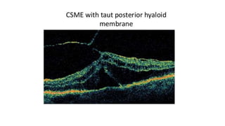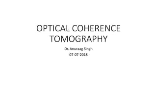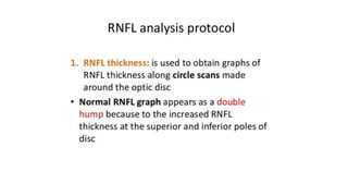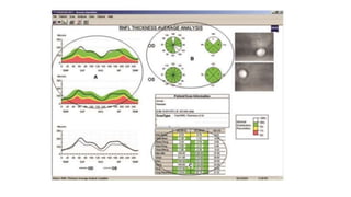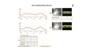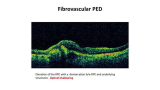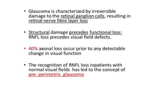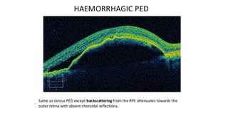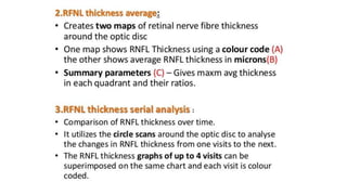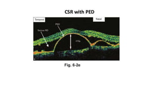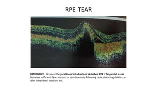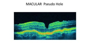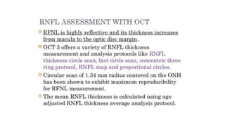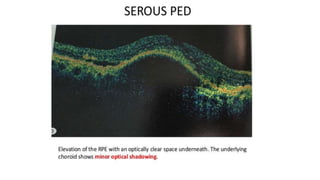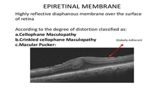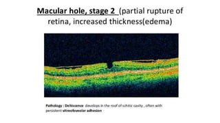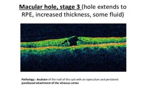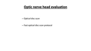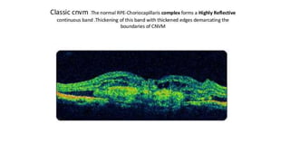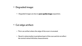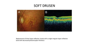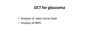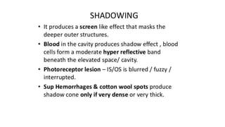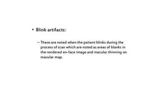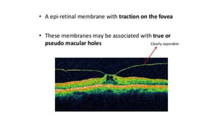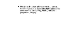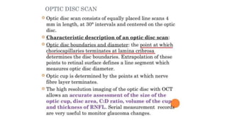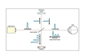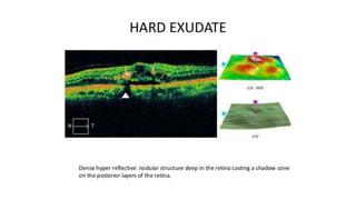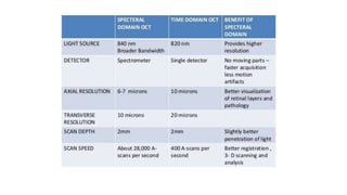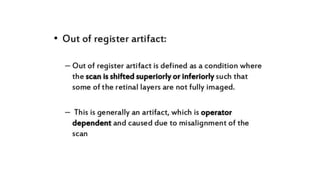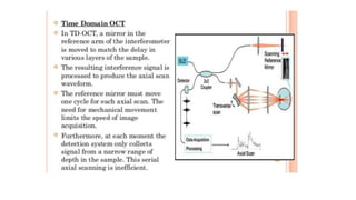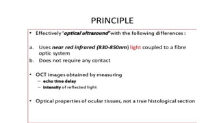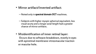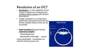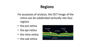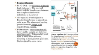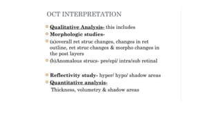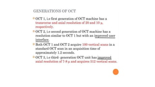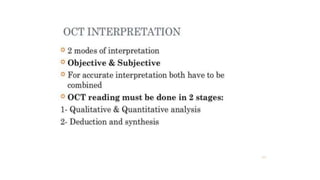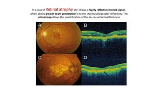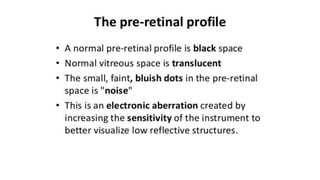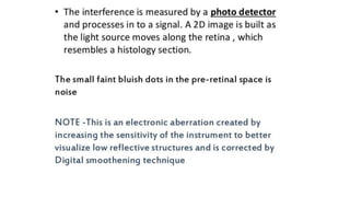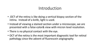 This document discusses optical coherence tomography (OCT) of the retina. OCT uses light instead of a knife to perform a vertical biopsy of the retina, presenting a false-color view with micron-level resolution without physical contact. The document describes various hyper-reflective and hypo-reflective features that can be seen on OCT scans and what they indicate, such as blood, exudates, cysts, edema, and more. It also discusses swept-source OCT which overcomes limitations of previous OCT to enable better visualization of deeper structures like choroidal layers and discusses uses of swept-source OCT in glaucoma to examine microstructural changes in the lamina cribrosa.