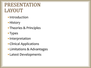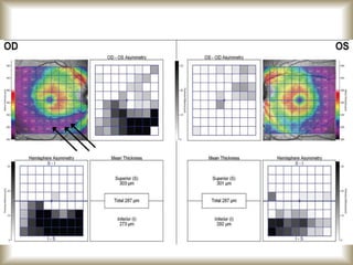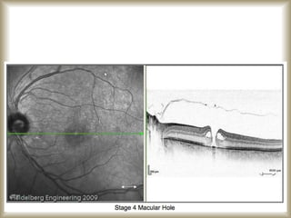 This document provides an overview of optical coherence tomography (OCT), including its history, principles, types, interpretation, clinical applications, limitations, and recent developments. OCT is a non-invasive imaging technique that uses infrared light to generate high-resolution cross-sectional images of the retina and anterior segment. Newer spectral domain OCT systems provide faster scanning speeds and higher resolution compared to earlier time domain OCT systems. OCT is useful for diagnosing and monitoring retinal diseases like glaucoma as well as anterior segment conditions. Interpretation of OCT images involves identifying layers and structures that appear as various colors based on reflectivity. Recent advances include enhanced depth imaging to view deeper choroidal structures and software to quantify retinal thickness and nerve fiber layer measurements.