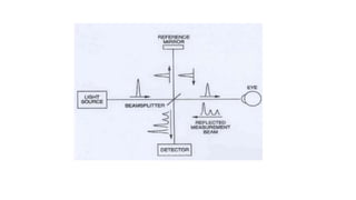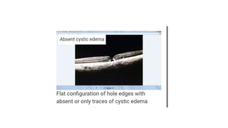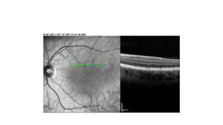 Optical coherence tomography (OCT) can be used to identify and characterize different patterns of diabetic macular edema (DME). Common patterns include diffuse retinal thickening, cystoid macular edema, and serous retinal detachment. Cystoid macular edema appears on OCT as fluid-filled cystic cavities within the retinal layers. As DME progresses, cysts may enlarge and coalesce. Hard exudates appear as small, hyperreflective foci that cast shadows. Disruption of the ellipsoid zone is associated with worse visual acuity in DME patients. OCT is useful for monitoring response to DME treatment.
