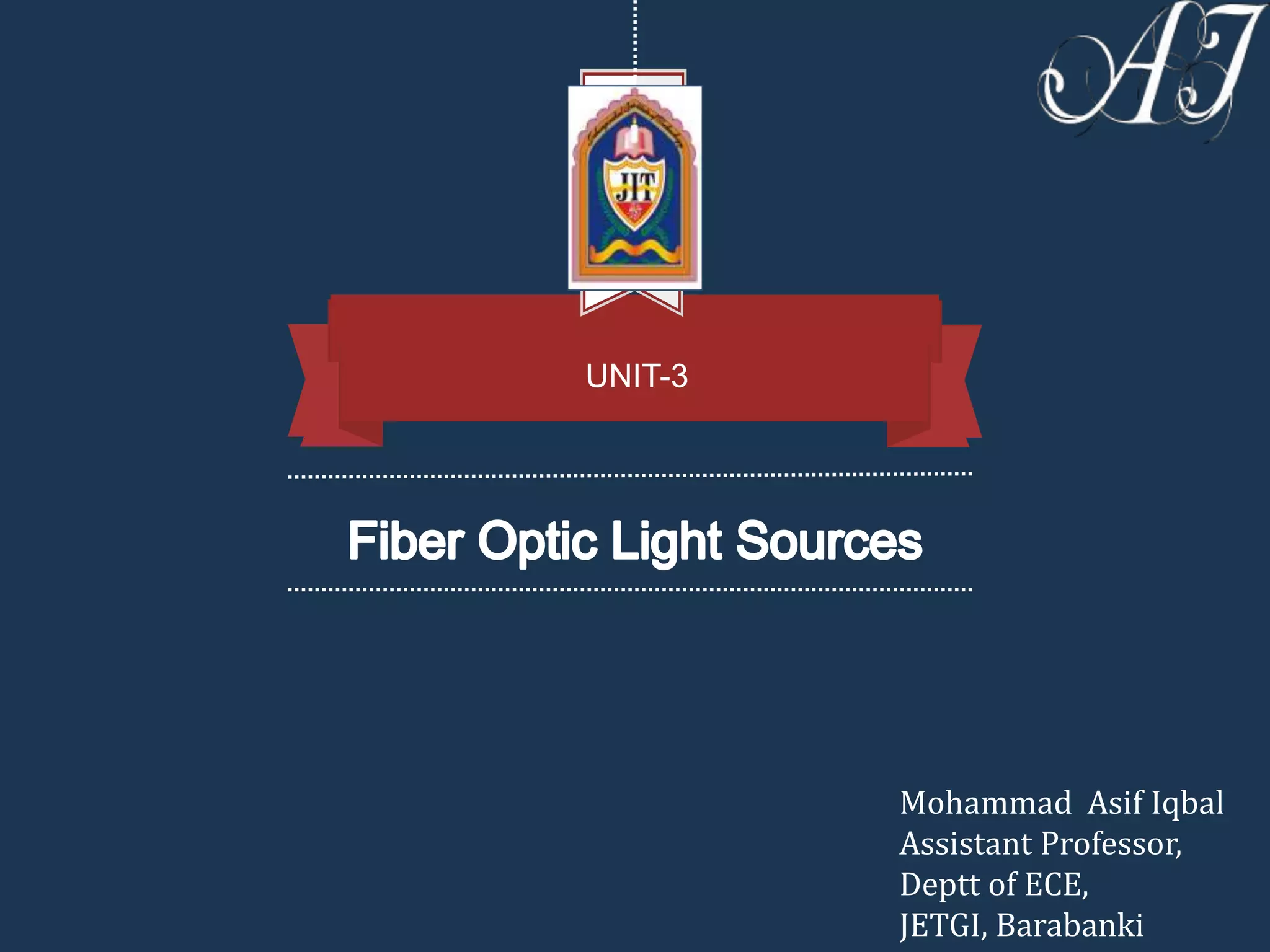 Optical sources convert electrical signals to optical signals for data transmission through fiber optic cables. They include LEDs, ELEDs, SLEDs, and laser diodes (LDs). LEDs produce incoherent light while laser diodes produce coherent light. Incoherent light sources are used for multimode fiber systems while laser diodes are used for single mode systems. Laser diodes must operate above the lasing threshold to produce coherent light, otherwise they function as ELEDs. Tunable lasers can produce coherent light of a controlled variable wavelength, allowing them to replace multiple light sources in multi-wavelength transmission systems.