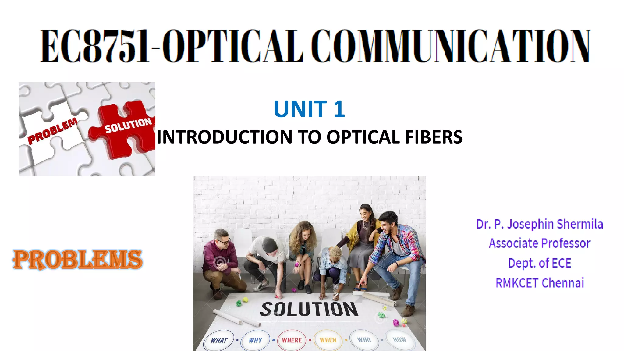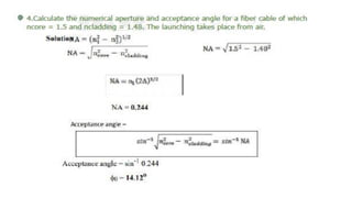The document introduces concepts related to optical fibers, including calculations for the angle of refraction, numerical aperture, and modes based on given refractive indices and dimensions. Specific problems involve determining the critical angle, acceptance angle, and normalized frequency of various fiber types. The document presents mathematical solutions for multimode step index fibers and their parameters.