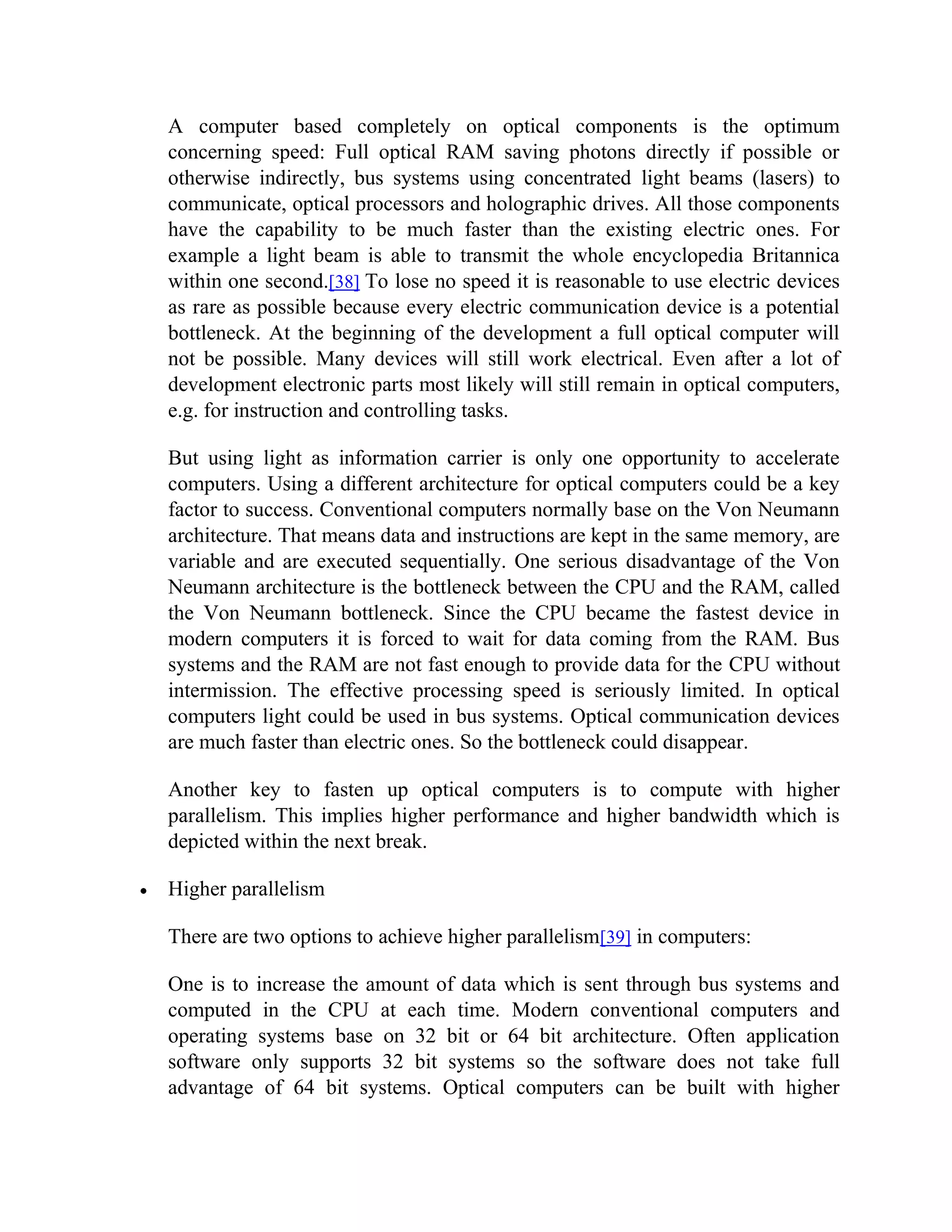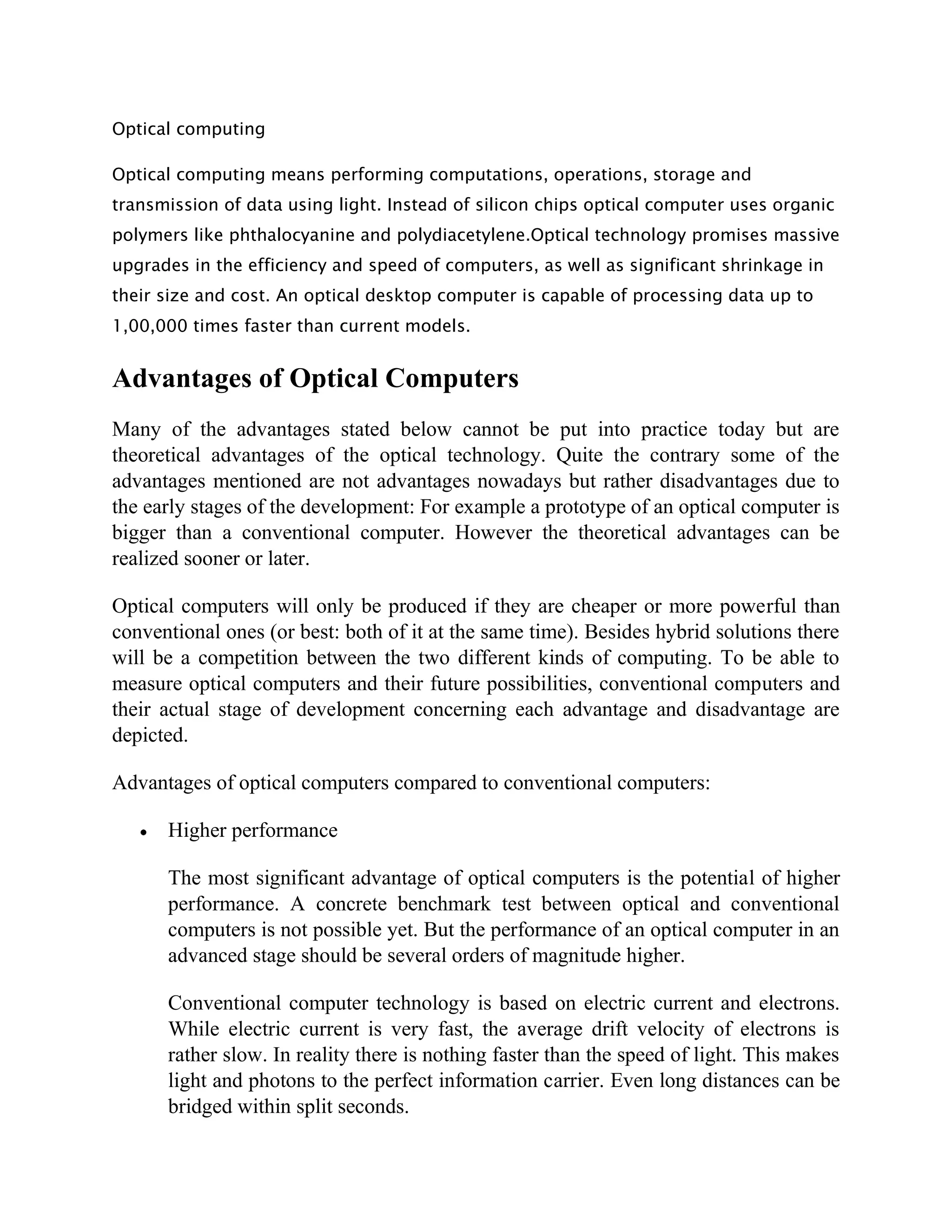 Optical computing involves performing computations using light rather than electricity. Optical computers promise vastly increased speeds, up to 100,000 times faster than current models, as well as significant reductions in size, cost, and energy usage due to light's superior transmission speed compared to electrons. However, optical components have not yet been sufficiently miniaturized for practical optical computers, and manufacturing such components with the necessary precision remains challenging.