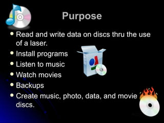 Optical drives use lasers to read and write data to discs, allowing users to install programs, listen to music, watch movies, back up files, and create discs. The document discusses the types of optical drives including CD, DVD, and Blu-Ray drives and burners. It also covers the necessary connections like power, data, IDE/SATA cables and external connections. Troubleshooting tips are provided for issues like not being able to read or write discs. The process of removing and installing an optical drive is outlined as shutting off power, unplugging cables, removing screws, and reversing the steps for installation.