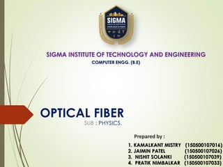 The document discusses optical fibers, including their structure, modes, and the principles of total internal reflection. It highlights the advantages of optical fibers over copper, their applications, and the challenges of maintenance and jointing. Additionally, it covers fiber bragg gratings (FBGs), their creation, characteristics, and current applications in various optical systems.