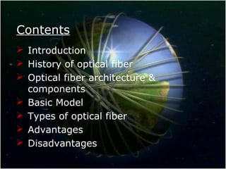 This document provides an overview of optical fiber communication. It discusses the history and development of optical fibers, including the discovery of total internal reflection and development of glass coatings to reduce signal loss. It describes the basic components of an optical communication system including light sources, fiber cables, and light detectors. It also covers fiber types, advantages like high bandwidth and low signal degradation, and disadvantages such as higher initial cost compared to copper cables.