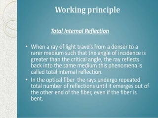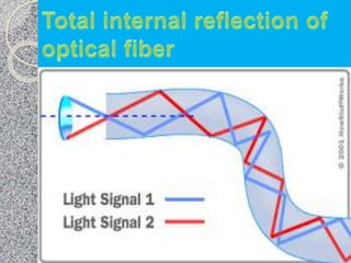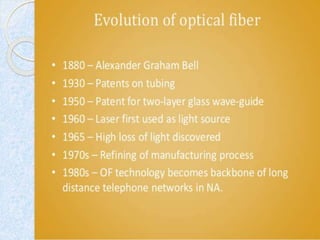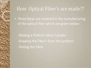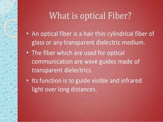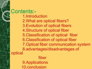 This document discusses the structure and classification of optical fibers. Optical fibers are classified based on the number of modes as either single-mode fiber or multi-mode fiber. The structure of an optical fiber communication system includes an information source, electrical transmitter, optical source, and optical fiber as the transmission medium. The optical source provides electrical-optical conversion, typically using a semiconductor laser or LED.