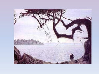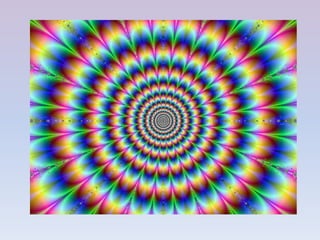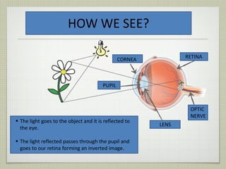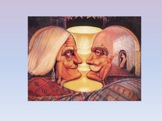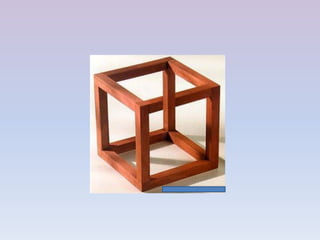 This document discusses visual perception and optical illusions. It explains how light enters the eye and is processed by the retina, optic nerve and brain to form images. However, the brain can incorrectly or falsely interpret visual information, leading to optical illusions. Several types of illusions are presented, including ambiguous figures that can be interpreted in multiple ways, anamorphic figures that appear distorted but reveal hidden images, and impossible images that defy logic. The document aims to demonstrate how visual perception can be tricked in interesting ways.