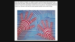 The document explores optical illusions and their effects on human perception, explaining how the brain can misinterpret visual information due to various factors such as movement and color fatigue. It discusses phenomena like afterimages and persistence of vision, illustrating how our visual system prioritizes information for survival. Additionally, it highlights the historical significance of the thaumatrope in the context of optical illusions and animation.
