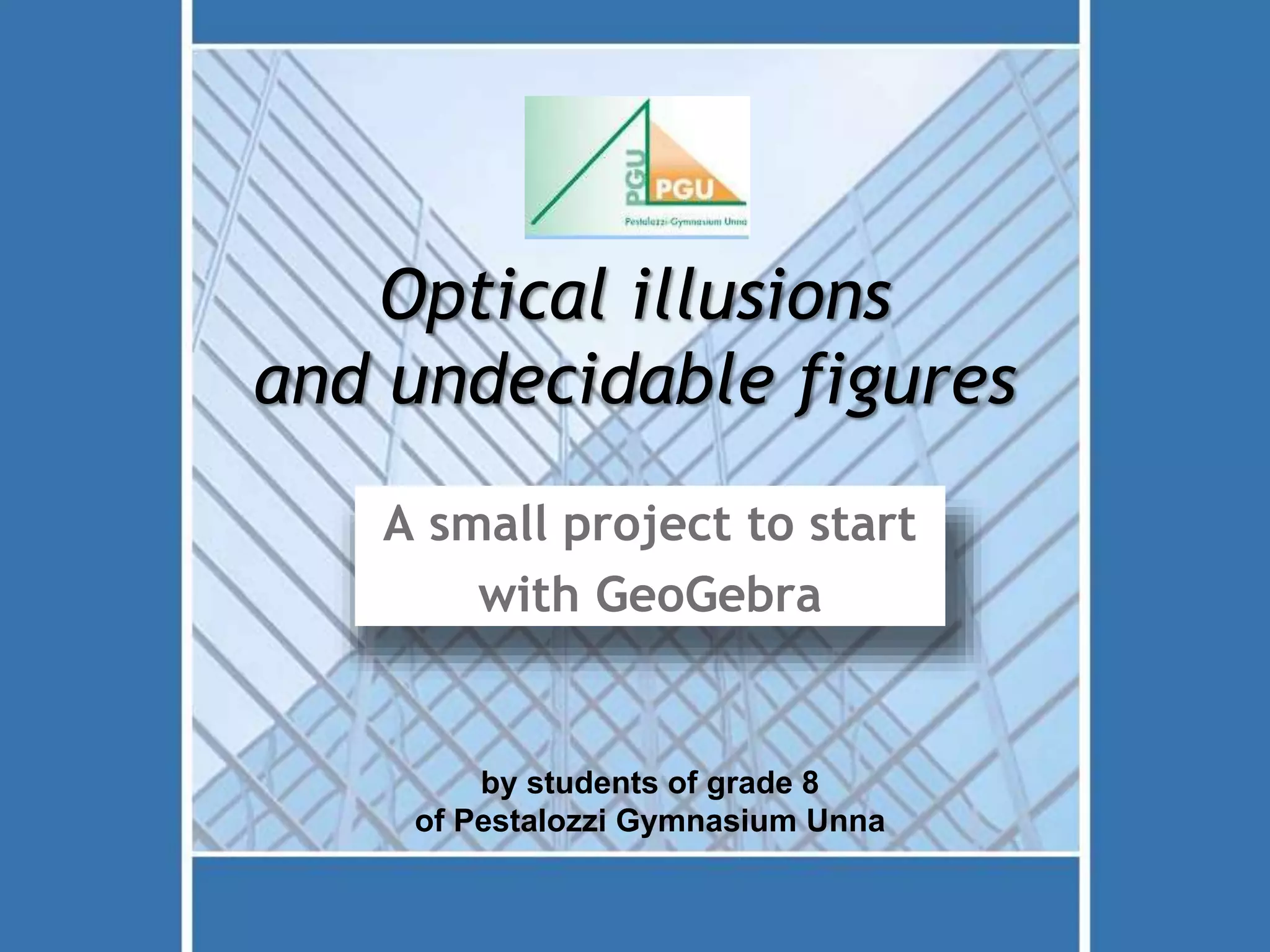 Grade 8 students in Germany constructed optical illusions and undecidable figures using GeoGebra as an introductory project to learn how to use the dynamic geometry software. Their teacher presented the project to demonstrate constructing simple illusions using basic tools like reflections, rotations, and the coordinate system. Students explained each illusion and why some figures were undecidable, often because they appear three-dimensional but cannot exist physically. The goal was to have students practice dynamic constructions while learning about optical tricks that confuse visual perception.