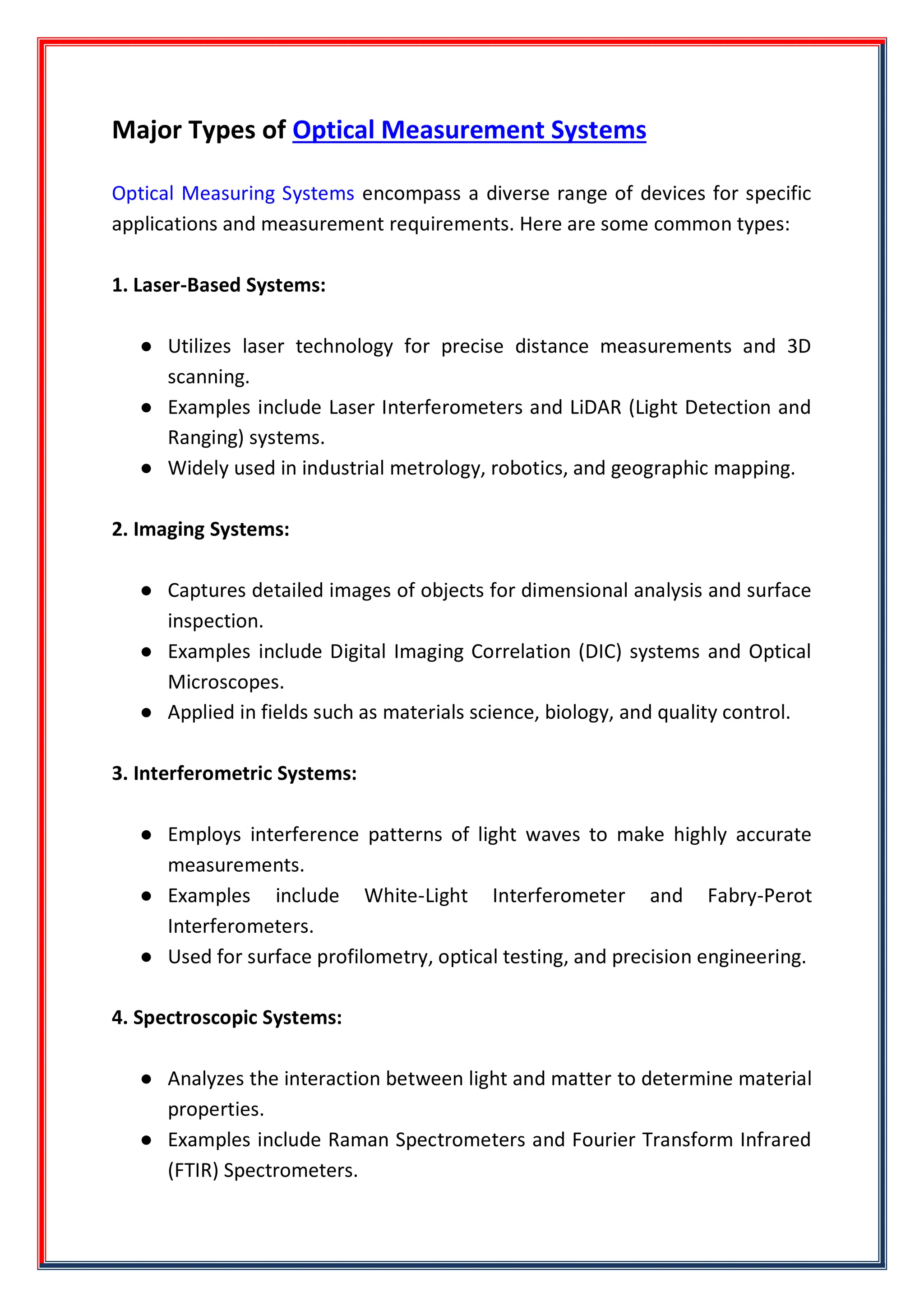 Optical measurement systems (OMS) are advanced non-contact devices that utilize light-based techniques to accurately measure physical properties of objects, crucial for precision manufacturing. Major types include laser-based, imaging, interferometric, spectroscopic, and confocal systems, each serving specific applications in industries like manufacturing, automotive, aerospace, medical, electronics, and semiconductor. Despite their advantages, OMS face challenges such as sensitivity to environmental factors and the need for skilled operation, with the View Benchmark™ 300 being highlighted as a leading optical measuring machine.