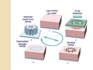 This document provides an overview of optical MEMS (Microelectromechanical Systems). It discusses how MEMS integrate microsensors, microactuators and microelectronics onto a silicon chip. It then focuses on optical MEMS, explaining how they fuse optics, MEMS and microelectronics. Key topics covered include fabrication techniques like bulk micromachining and surface micromachining, as well as applications like digital micromirror devices and fast optical switching using semiconductor optical cavities. The document highlights advantages of optical MEMS like high speed, density and cost effectiveness over electronic switches.