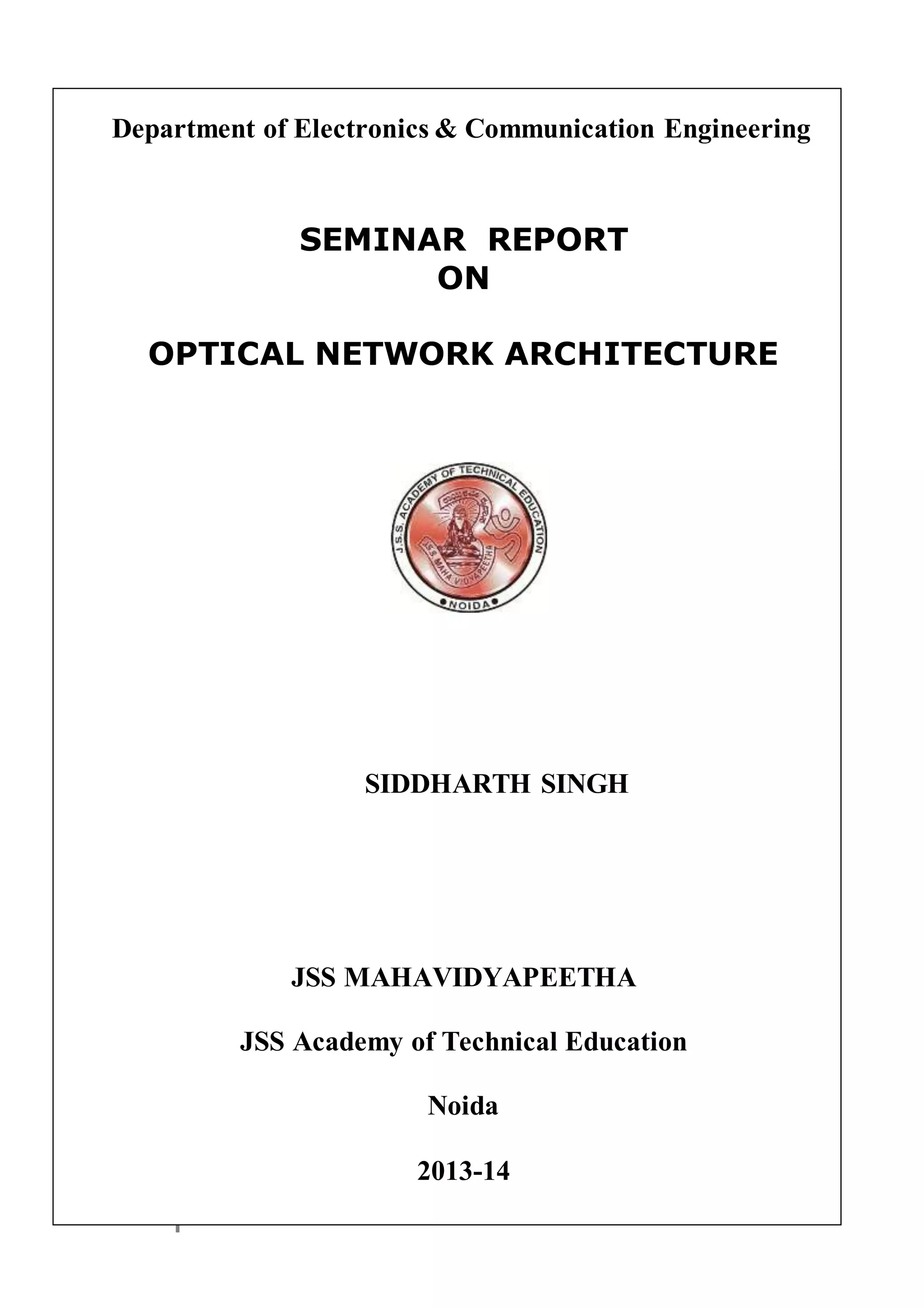 This document provides a seminar report on optical network architecture presented by Siddharth Singh at JSS Mahavidyapeetha. It begins with acknowledging those who helped and guided in completing the report. The abstract provides an overview of optical networks and how they provide high bandwidth through technologies like DWDM and routing/grooming at the wavelength level. It discusses network architectures like SONET, PONs, and topologies like bus, star and tree. The report is divided into chapters covering topics like DWDM systems, synchronous optical networking, PON history and elements, and network topologies.
