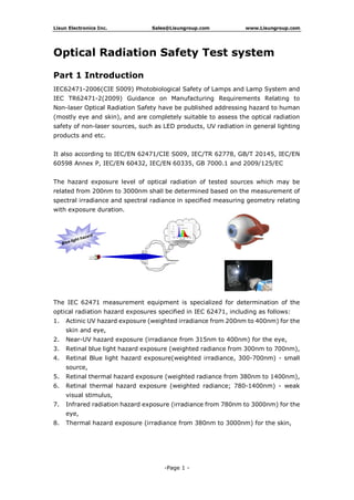 Lisun Electronics provides an optical radiation safety test system that measures the safety of lighting and electrical devices according to international standards. The system includes a spectroradiometer, retinal radiance meter, motorized goniometer, calibration sources, and software. It tests for hazards like UV exposure, blue light, and thermal radiation from 200-3000nm. The system identifies maximum exposures and classifies products' safety levels.