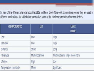 The document discusses the advantages and components of optical fiber communication systems, highlighting benefits such as high bandwidth, light weight, signal security, and low transmission loss. It details the design and function of optical transmitters, including their essential specifications like spectral linewidth and extinction ratio, as well as the roles of different components such as optical sources and modulators. Additionally, it addresses the factors affecting transmission distance in optical systems.